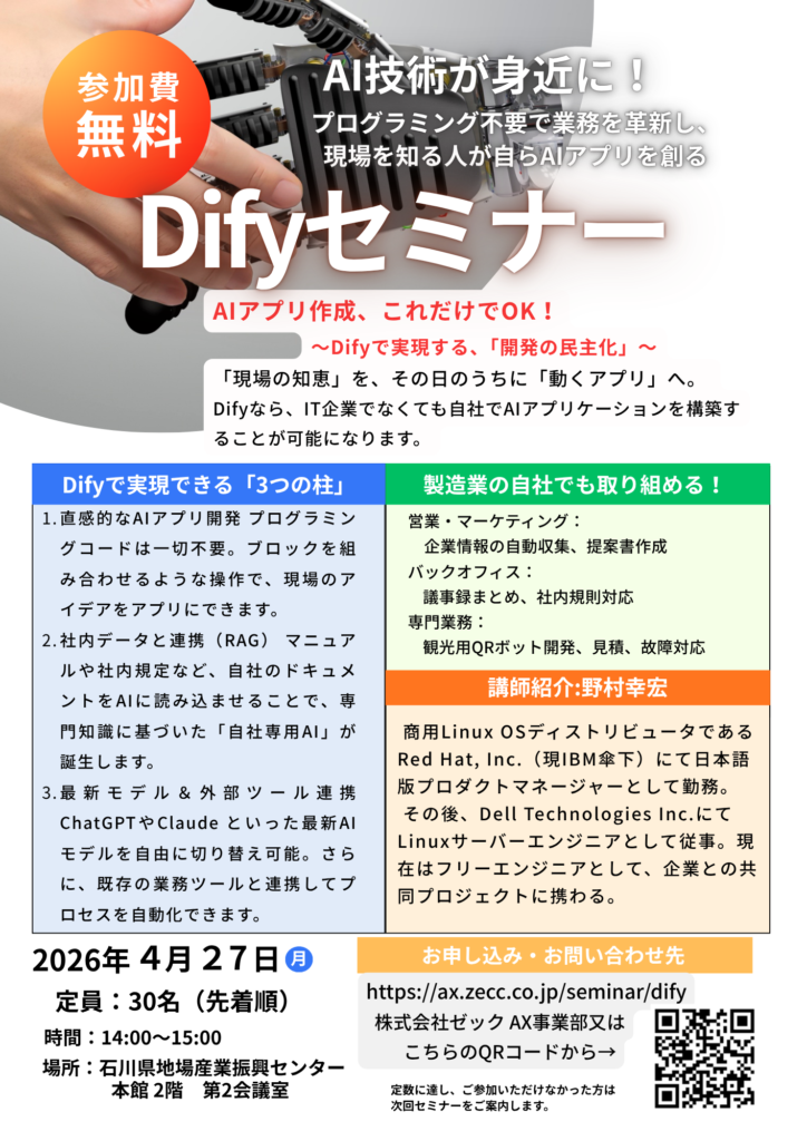 Difyで作る自社専用AIアプリ体験ワークショップ4/14